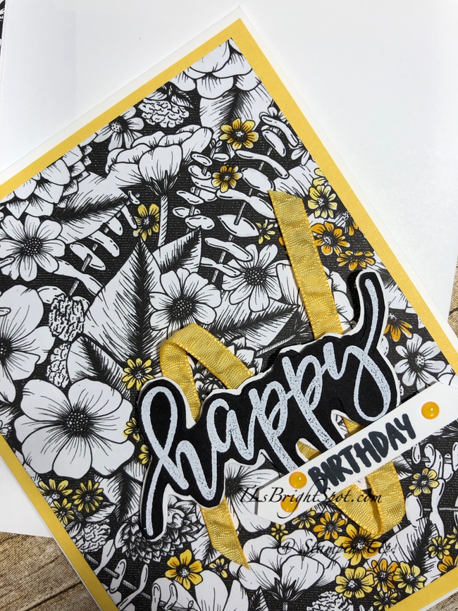 I die cut several pieces using the Perennial Petals Dies and Basic White card stock and then used what I wanted – so there were some extras left over. I used the Stitched Whimsy Dies to create an impression on the Basic White panel, then stamped the word ‘happy’ before adhering anything to the card front. i began adhering the Petals die cuts with liquid glue, beginning with the leaf spray. Isn’t this a wonderful leaf spray die cut? Love the openness and as though it’s ‘blowing in the wind’ kind of look. I adhered each of the flower parts just in the center, as I wanted just enough dimension for a bit of 3D. This Basic White panel was layered on a slightly larger piece of 2020-2022 In Color 6×6 DSP. I added dimensionals to the back and adhered this to the Thick Basic White card front.