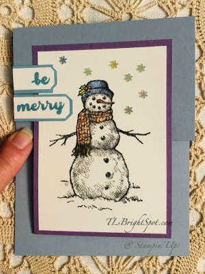 - Die cut yet another snowflake, this time from the Balmy Blue Glimmer Paper – love this paper! Adhere to the sentiment panel with a couple of dots of liquid glue.