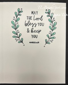 For the inside… I pulled another stamp set called Courage & Faith and stamped the sentiment in Memento ink on a Basic White panel, then each of the leafy stamps too. I colored the leaves with Shy Shamrock Stampin’ Blends, adhered the panel to the inside and the card was complete.