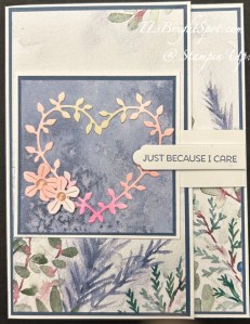 I combined a couple of Stampin’ Up! items… Winter Meadow DSP and the free during Sale-a-Bration bundle called Heart Shaped. It’s delicate, it’s beautiful and perfect for so many occasions.. Here I used I a heart stamped from paper I created with Blending brushes and several colors. I’ll link to the post here that will give all the info about how to do that. The two small flowers were die cut from that same paper with dies from Heart Shaped Dies.