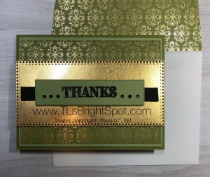 - Cut a piece of Whisper White 3 3/4″ x 5″. Stamp the sentiment from the Ornate Thanks stamp set using Tuxedo Black Memento ink. Adhere a strip of the Ornate Garden SDSP 1/2″ x 5″ toward the bottom as shown. Adhere the Whisper White to the Pear Pizzazz already attached to the inside of the card and voila!