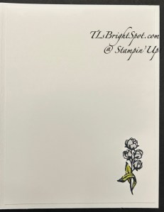For the envelope… another stamped image in Memento ink Simply Beautiful stamp set & colored with Stampin’ Blends Petal Pink & Old Olive. The flap has the same Fresh Freesia Lovely & Beautiful SDSP trimmed to fit. For information about shopping with me or joining my team, see below.
