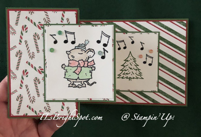 The smaller z-fold is a card base of Garden Green again, but this time I used the Sweetest Christmas 12 x 12 DSP for base layers on all three panels then a stamped panel of Basic White. Of course the stamped panels are from the Caroling Mice stamp set, stamped in Memento ink for the mouse and Garden Green ink for the tree. I colored the mouse with Watercolor Pencils and used the Blender Pen to smooth the pencil lines. :O) The music notes are stamped in Memento ink & colored with the Basic Black Marker. I added Adhesive-Backed Seasonal Sequins in both Sweet Sorbet & Garden Green to enhance those stamped panels.