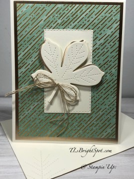 - Adhere the longer leaf to the sentiment panel, just the bottom of the leaf. Put dimensionals on the remainder of the leaf and on the sentiment panel. Adhere to the card front and voila – front is complete!